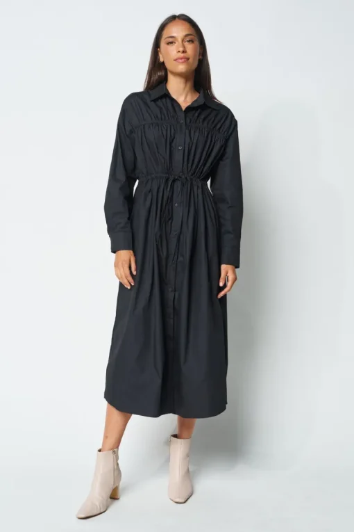 The Avalon Drawstring Button-Down Dress is your new style companion, designed for ultimate comfort and versatility. Crafted from a sleek black poplin fabric, this dress offers ample fit through the body and a drawstring waistline, making it both bump and breastfeeding-friendly.